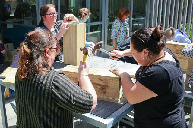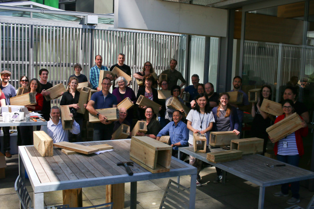 People build trap boxes (jpg 126KB) Author: Laura Honey Copyright: DOC, Crown Copyright License: CC-BY Description: DOC staff build trap boxes at Conservation House |